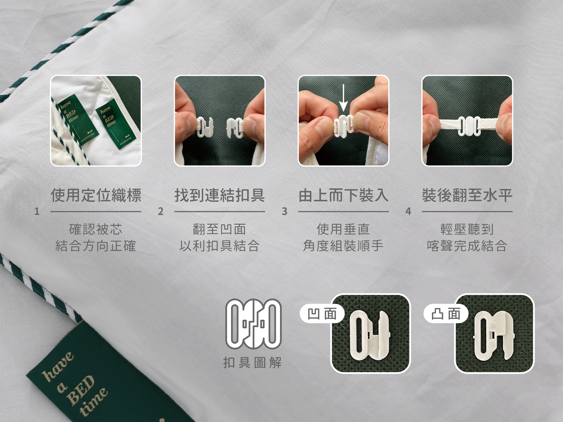 每一條好關係的被芯在四個被角都有加裝連結扣具,