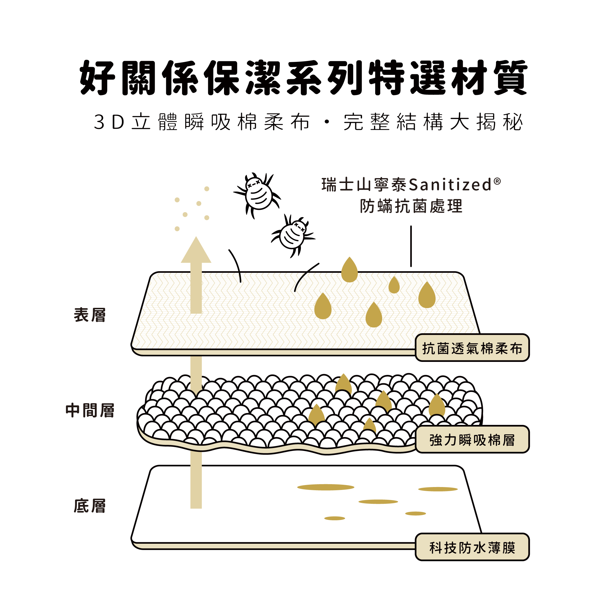 舒適與機能兼具,獨特立體針織工法,布料材質柔軟且增加吸水量;表層加入萊賽爾纖維,天然透氣親膚;強力瞬吸棉層,快速吸收水分不外滲,避免二次污染。