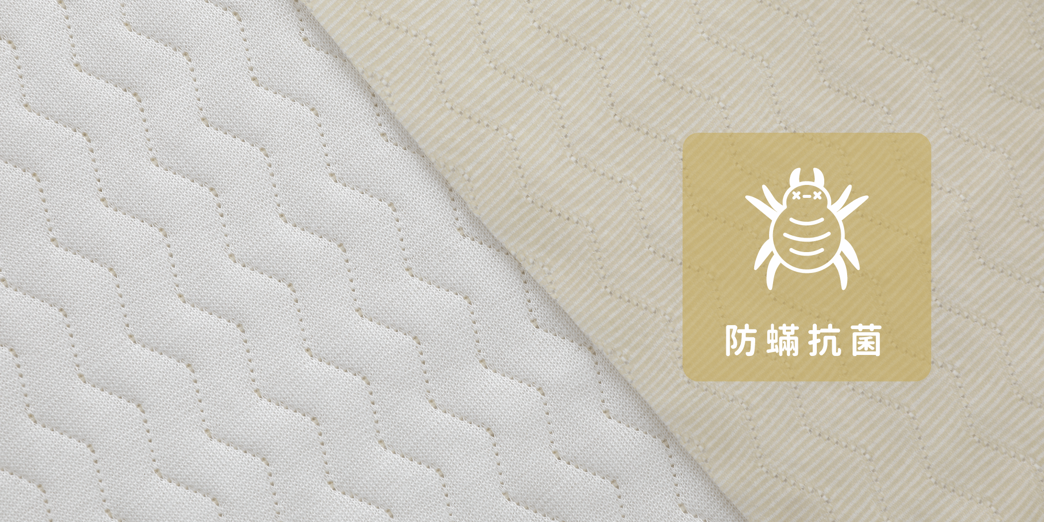保潔墊底層的科技薄膜孔徑小,可有效阻擋蟎蟲進出;為了同步防止蟎蟲在保潔墊上活動,表層再使用瑞士山寧泰Sanitized® 做處理,達到化學性及物理性雙效並行的全效防蟎。保潔墊經處理過後,不僅防蟎,更達到抗菌、防霉三效合一,也減少異味產生及過敏發生機率。