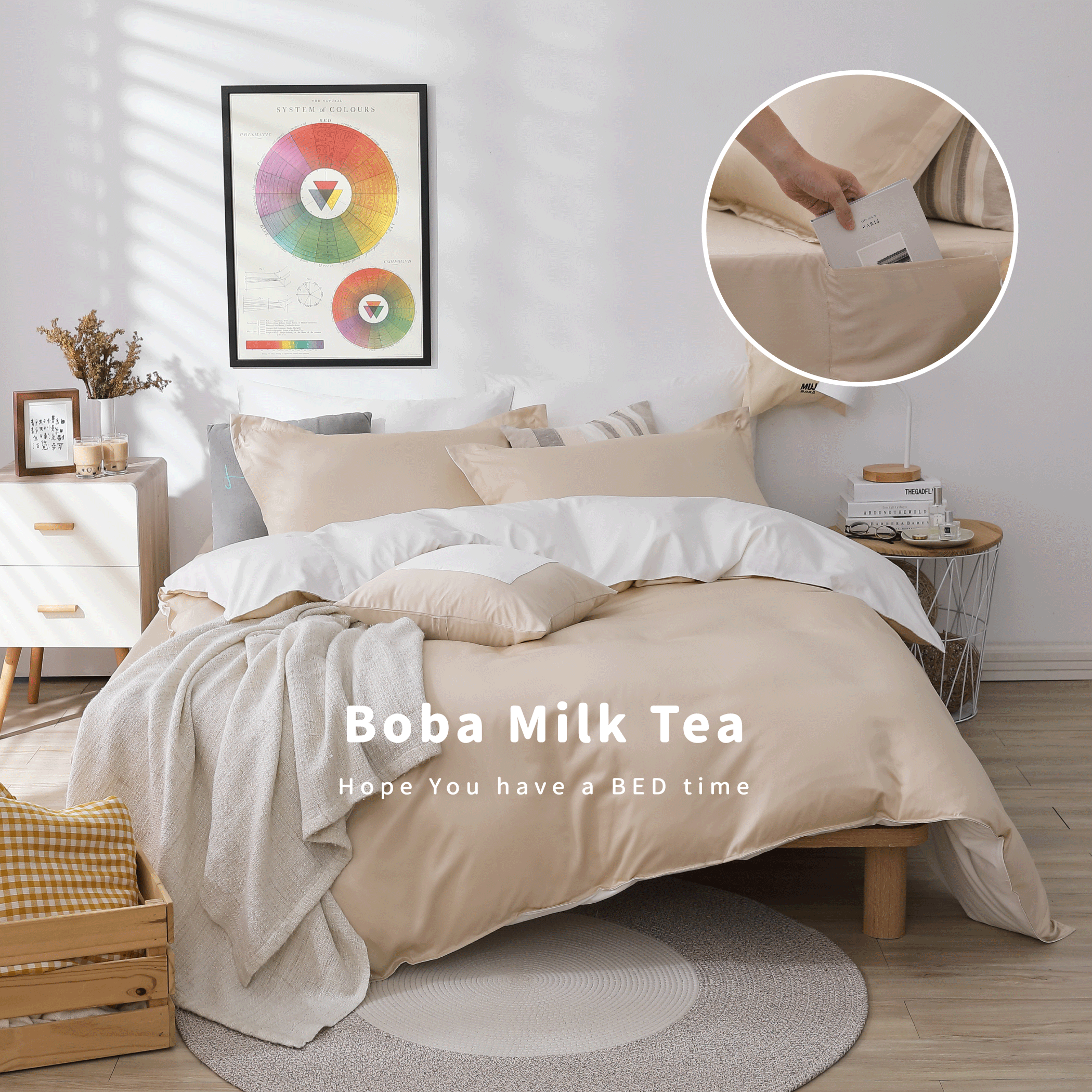 珍珠奶茶-新天絲棉床邊口袋經典四件組