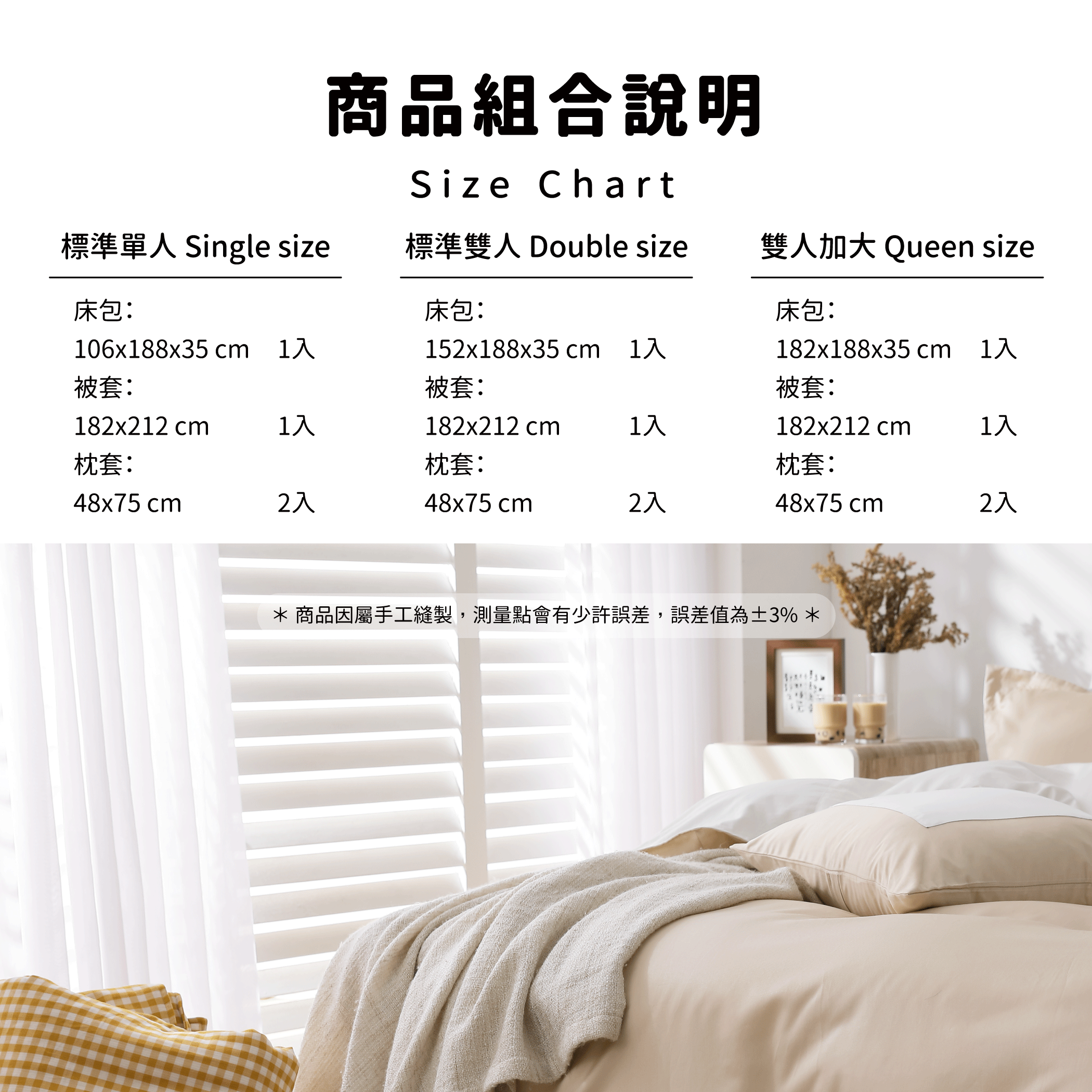 組合內含:奶茶色床包 1 入、雙色薄被套 1 入、雙色枕套 2 入