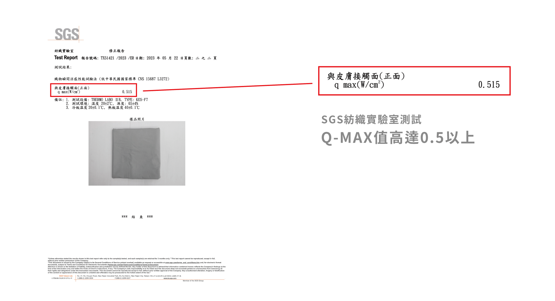 註:根據財團法人紡織產業綜合研究所制定的「織物瞬間涼感驗證規範」,以 Q-MAX值作為標準,針織物≧0.13W/cm²,而梭織物≧0.17W/cm²,才能稱之為涼感材質。