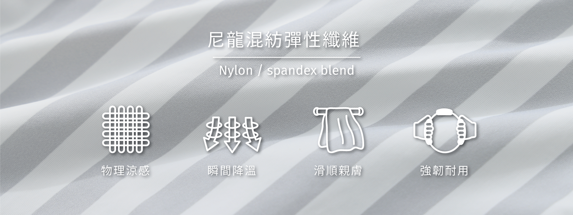 尼龍纖維具有極佳親水性,加上吸熱散熱、熱傳導能力快速,可以在接觸皮膚的瞬間提供涼爽的感覺。像這樣藉由布料纖維本身的特性來達到散熱降溫效果的方式稱為「物理涼感」,使用物理涼感原理製成的尼龍涼感布料,涼感效果持久,即使經過多次洗滌涼感效果也不會退化。