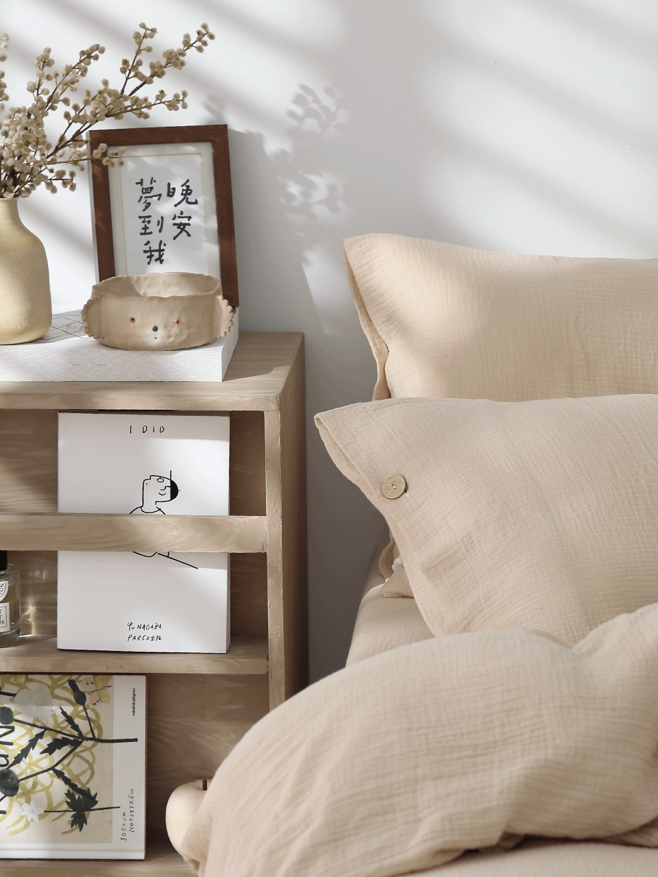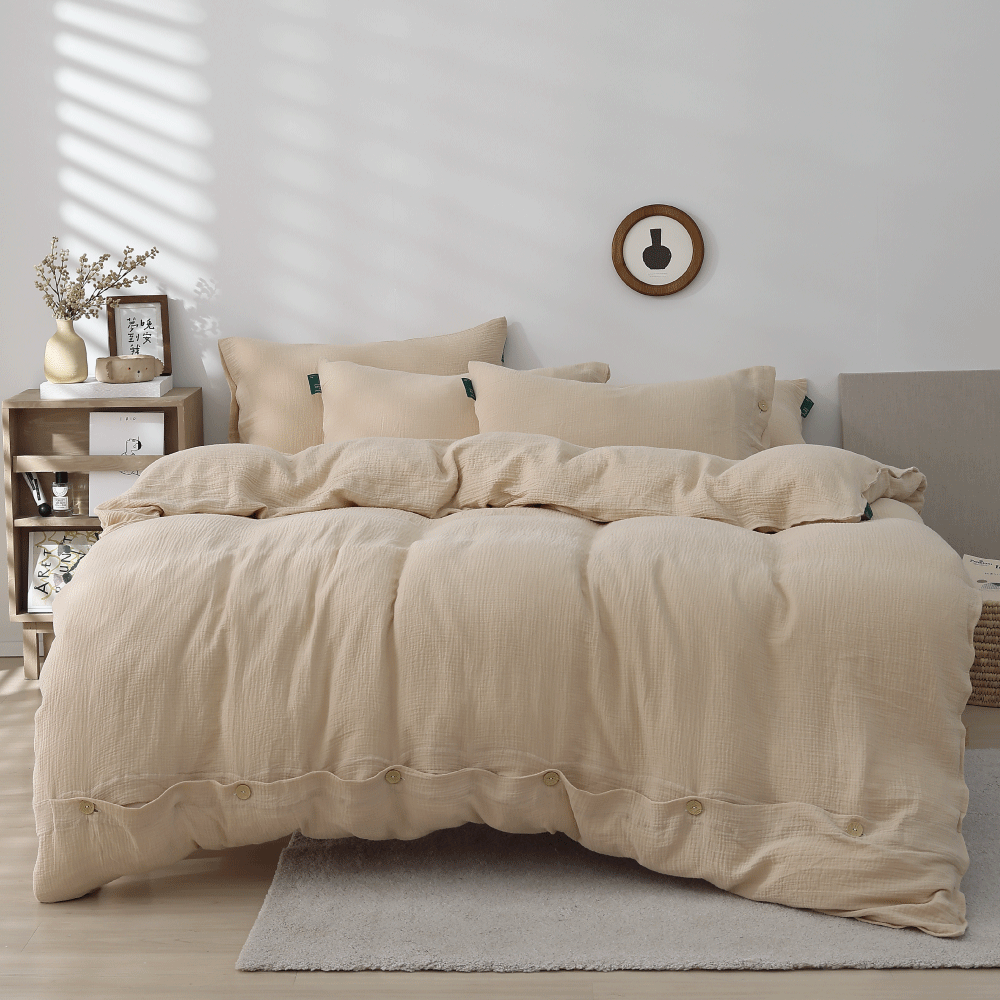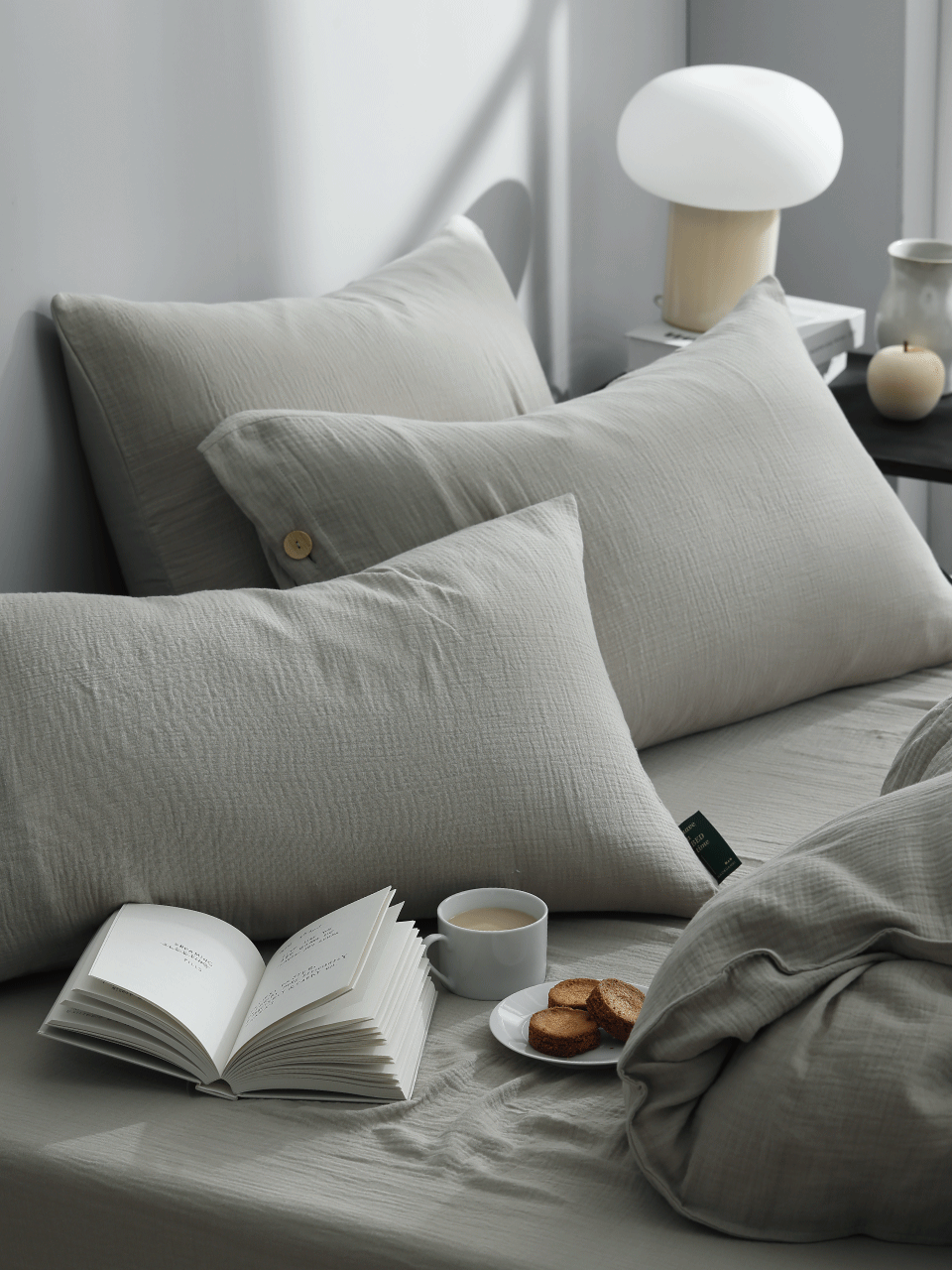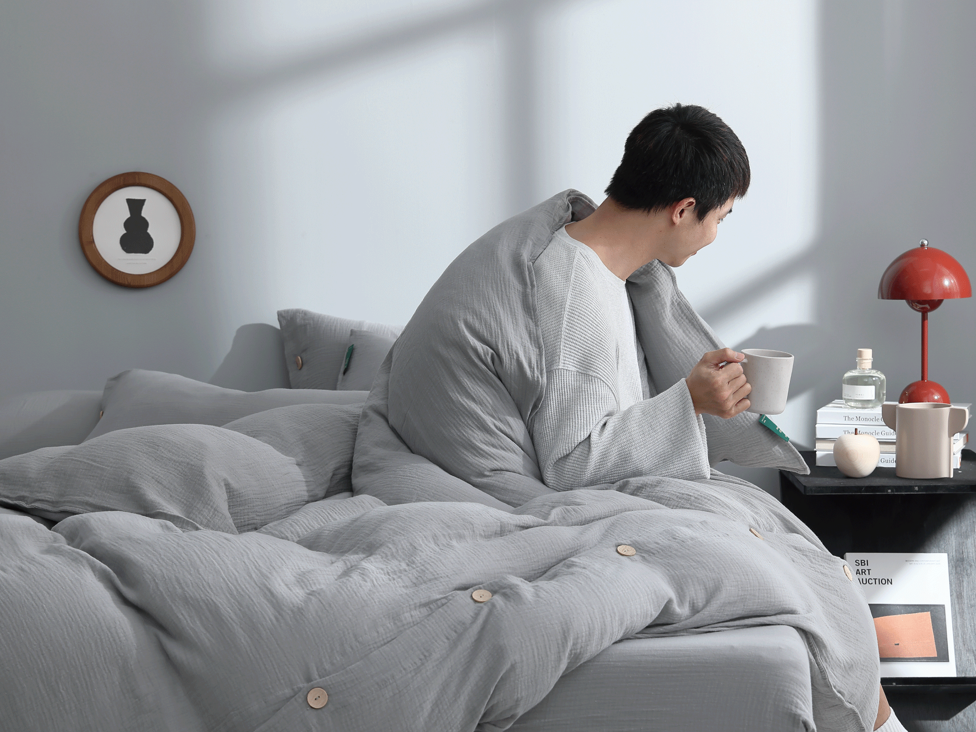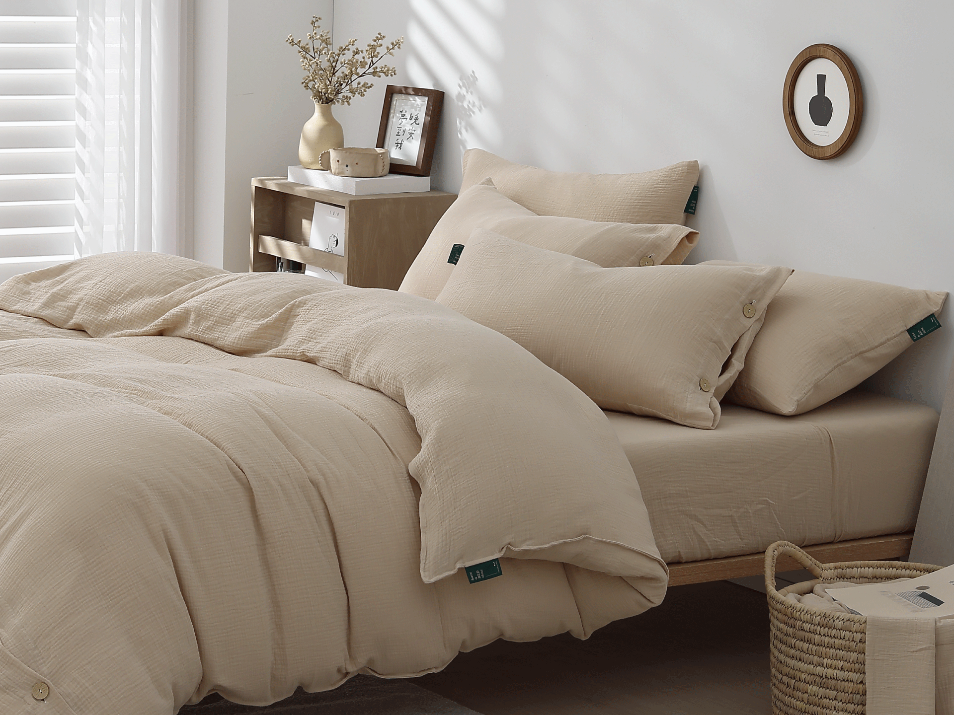 延續《靜謐自然》的舒適體驗,這次的寢具依然選用了親膚的二重紗,細緻的雙層結構讓布料蓬鬆透氣,如空氣般輕盈,卻帶著恰到好處的溫暖。每一寸柔軟的紋理,都承載著時間的溫柔痕跡,觸碰時,彷彿能感受到來自大自然的安撫。我們也特別挑選了更柔和的色系,讓視覺與觸感都能同步放鬆,為日常帶來寧靜的片刻。