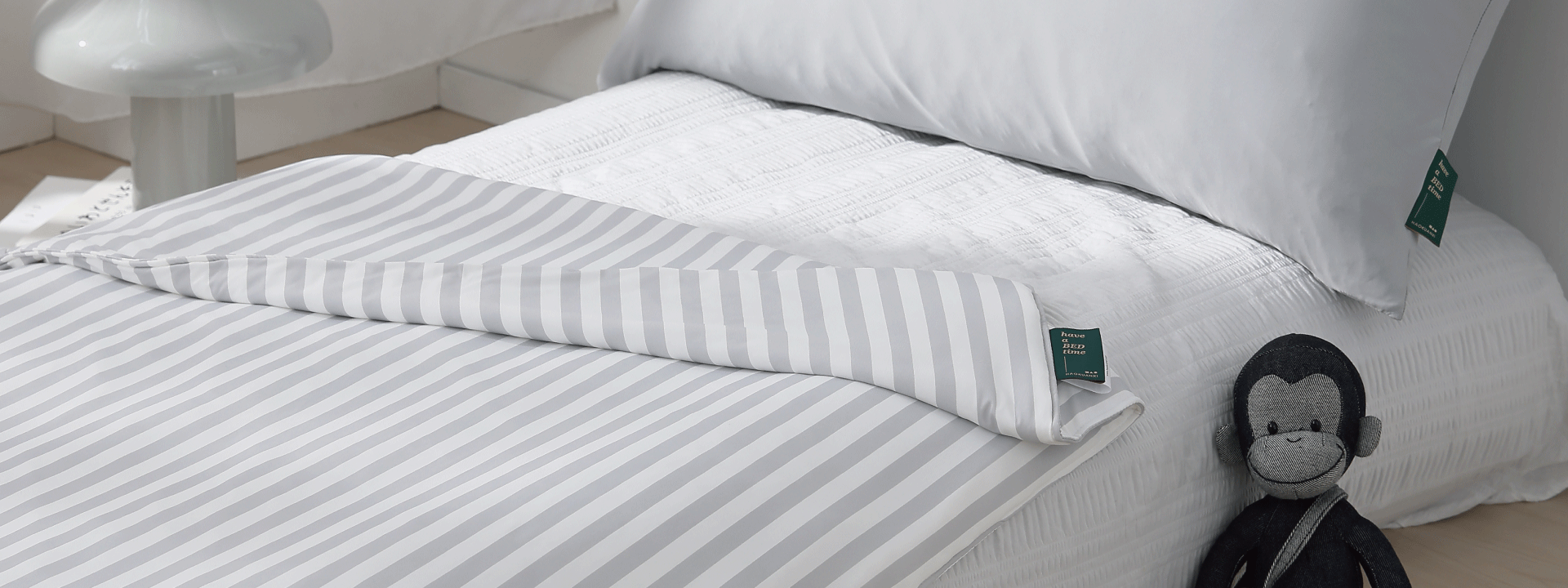 延續漂浮涼感被的涼感訴求,雙面涼感設計,為孩子打造雙倍涼感體驗,涼感被內裡添加奈米鋅離子,更增加抗菌除臭功能,加上經典條紋設計,質感與實用兼具。