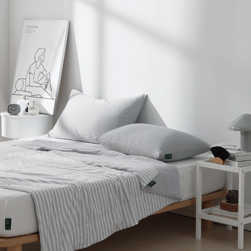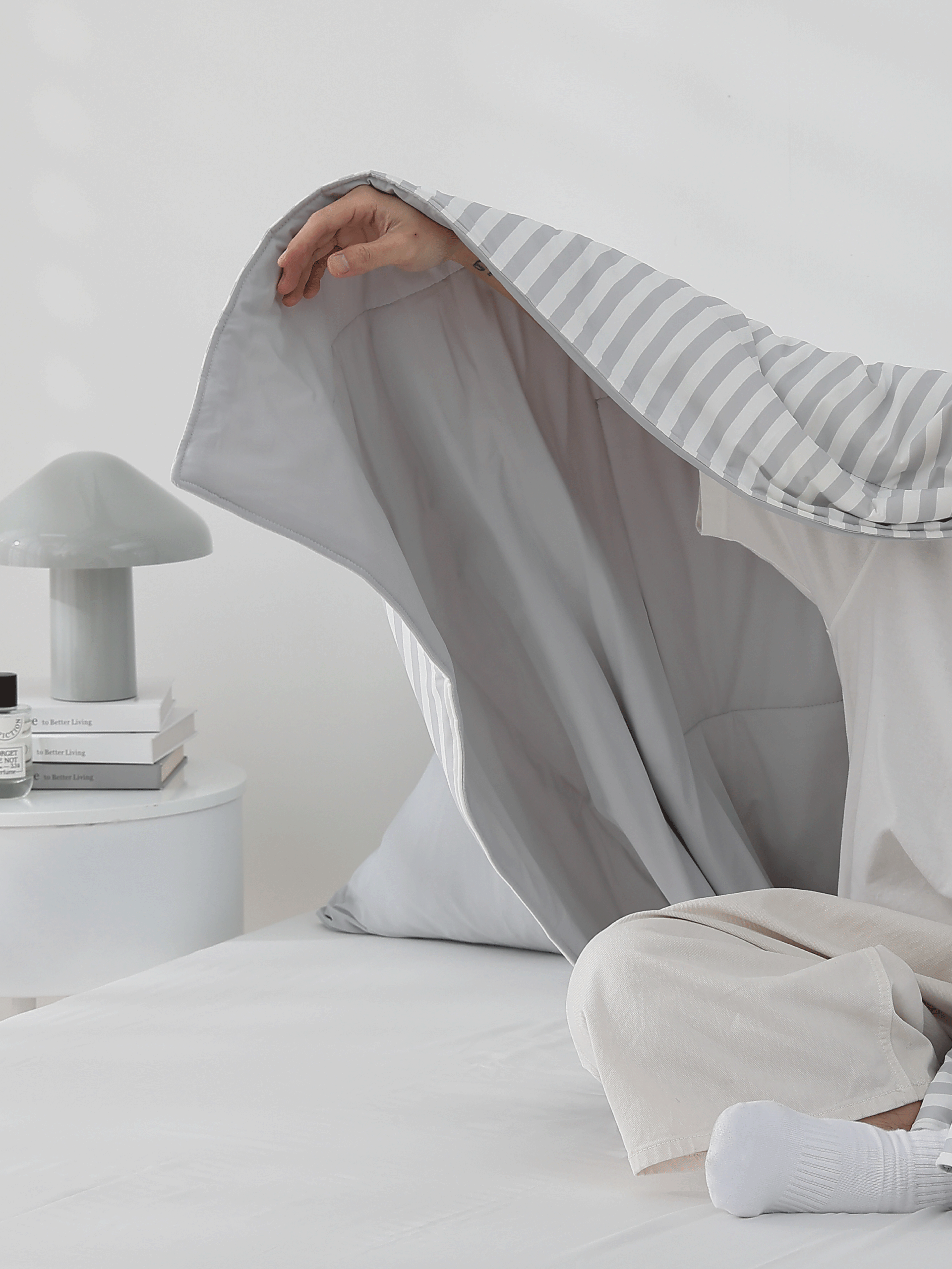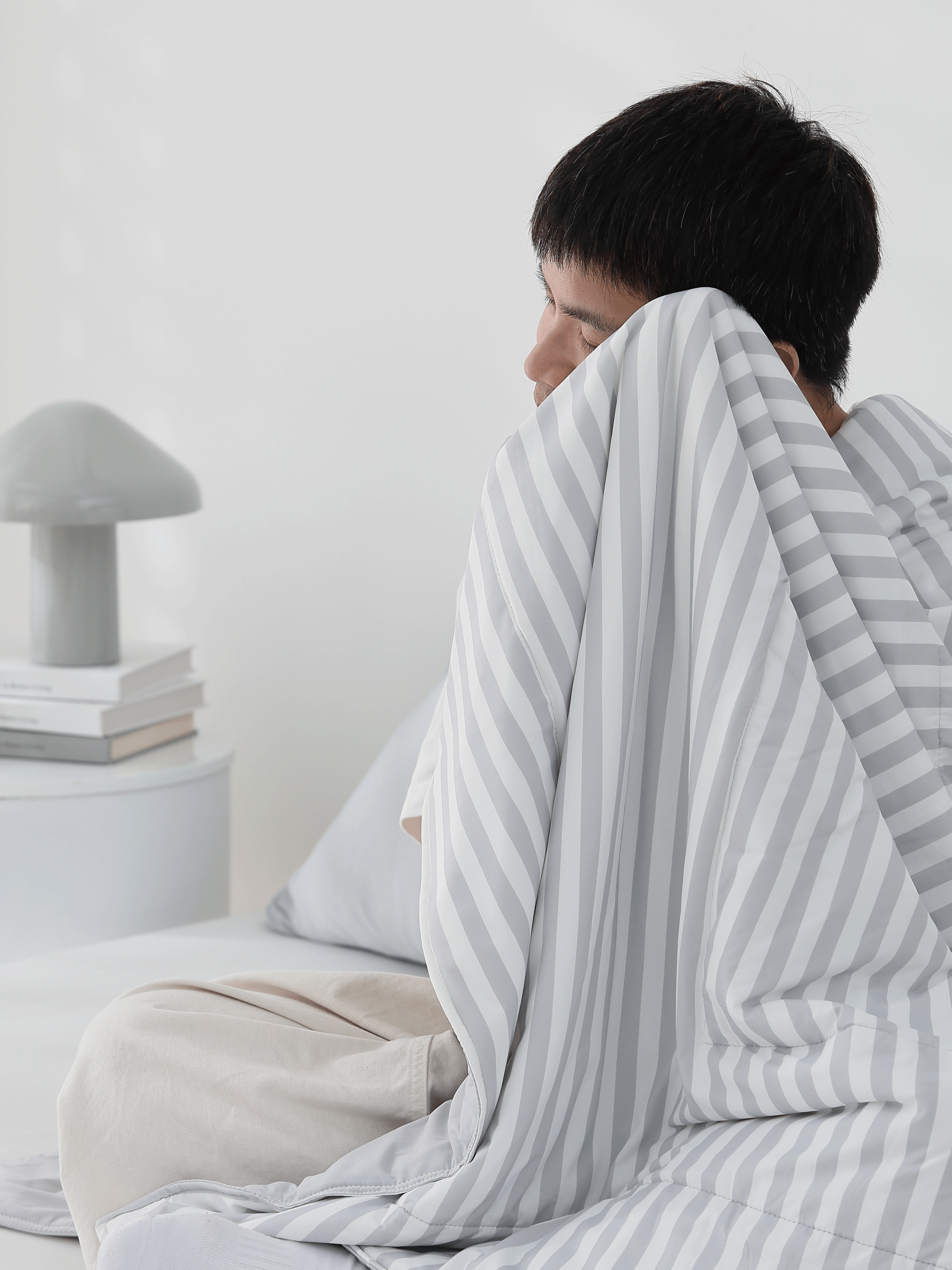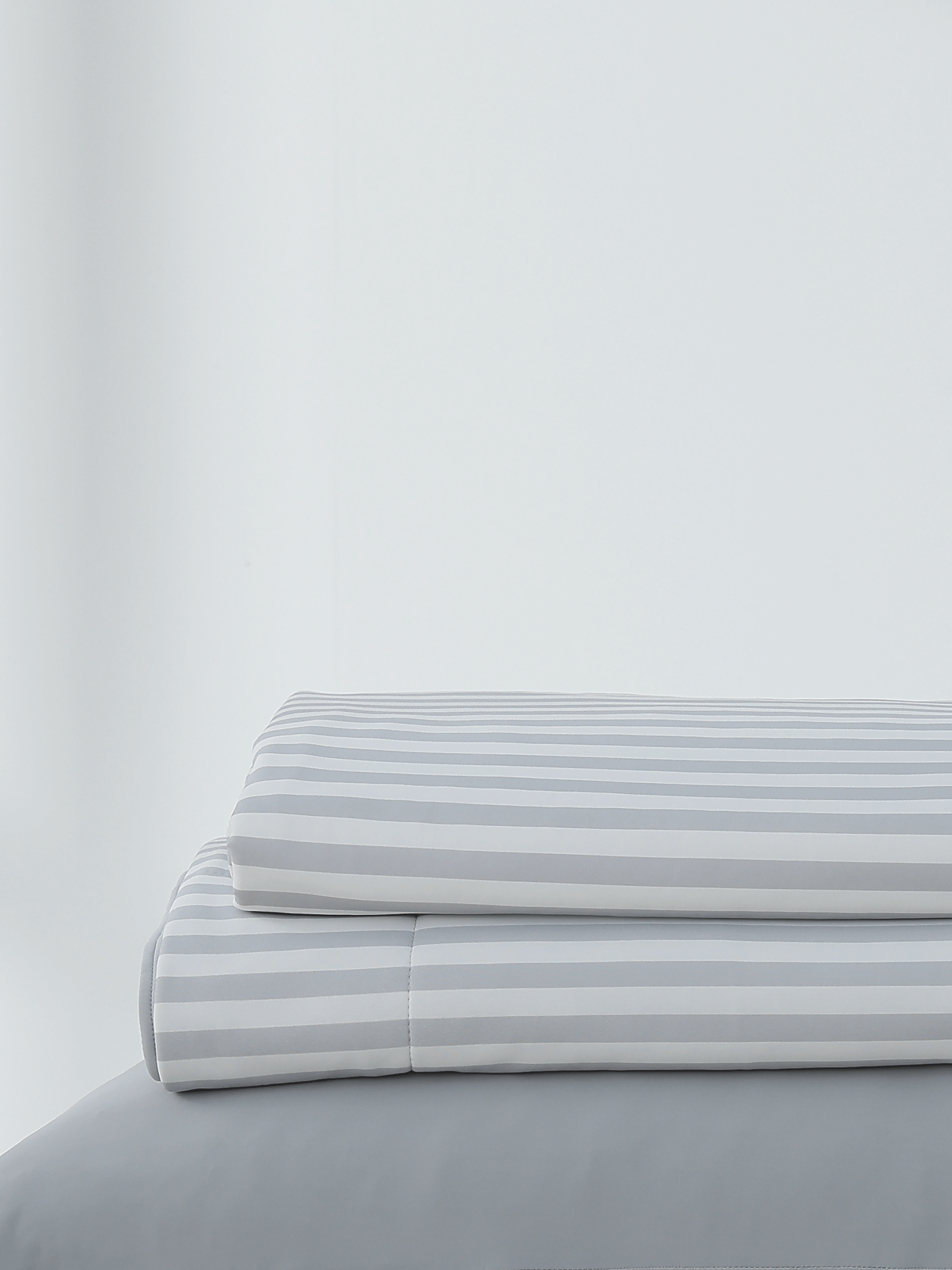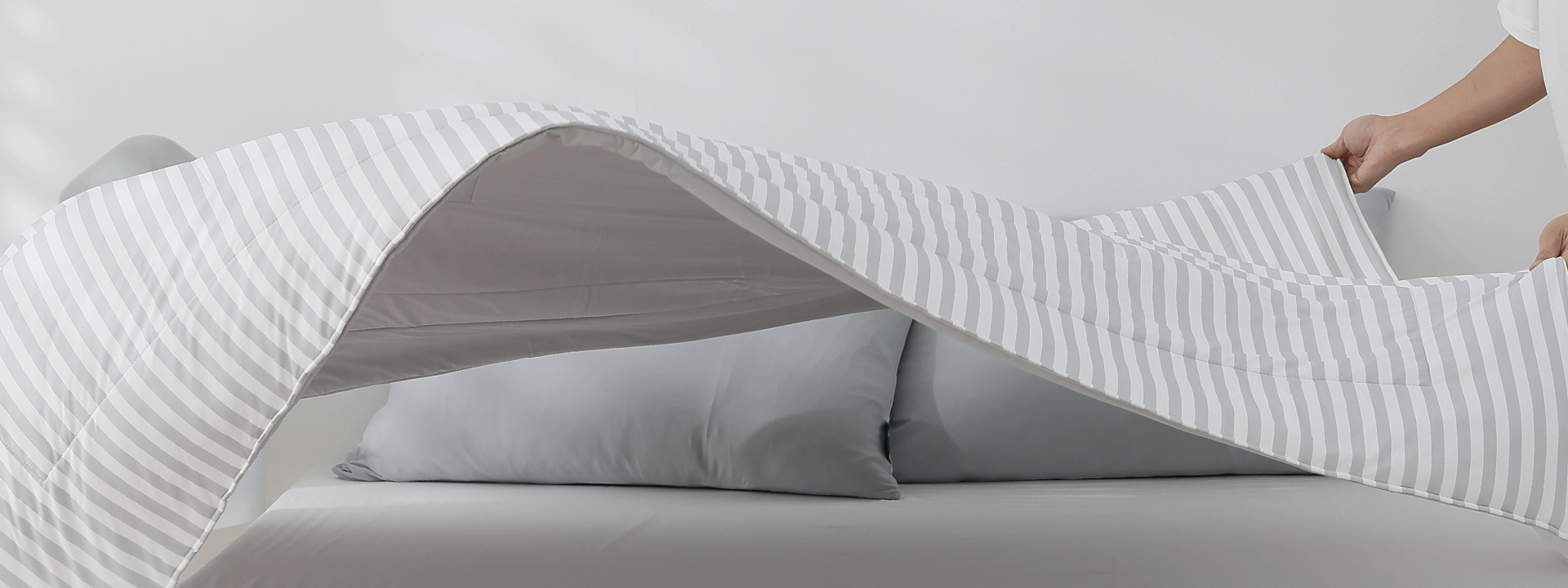 雙面涼感設計,打造雙倍涼感體驗,內裡加入奈米鋅離子,增加抗菌除臭功能。實用之外同時兼顧設計,花色為一面條紋、一面清涼薄灰,兩面交互使用,輕鬆打造房間風格。