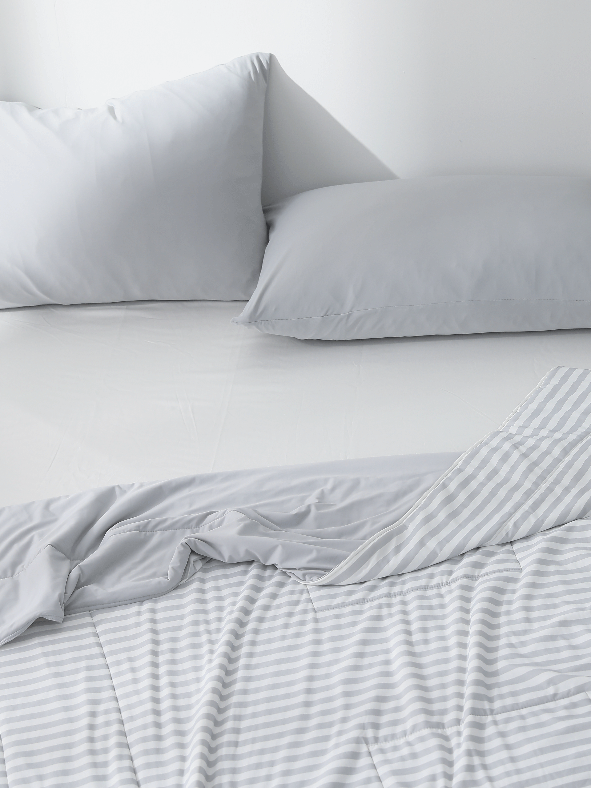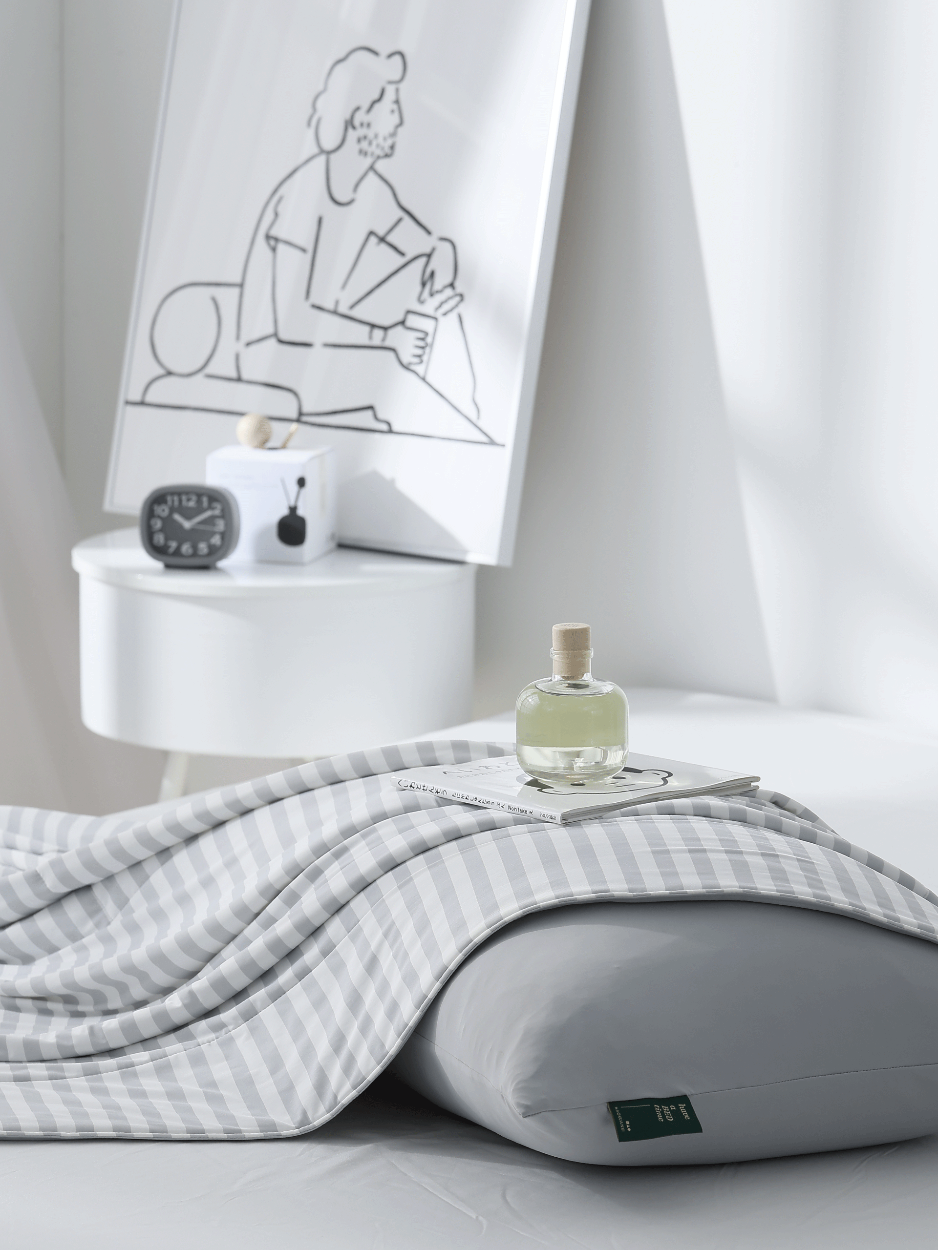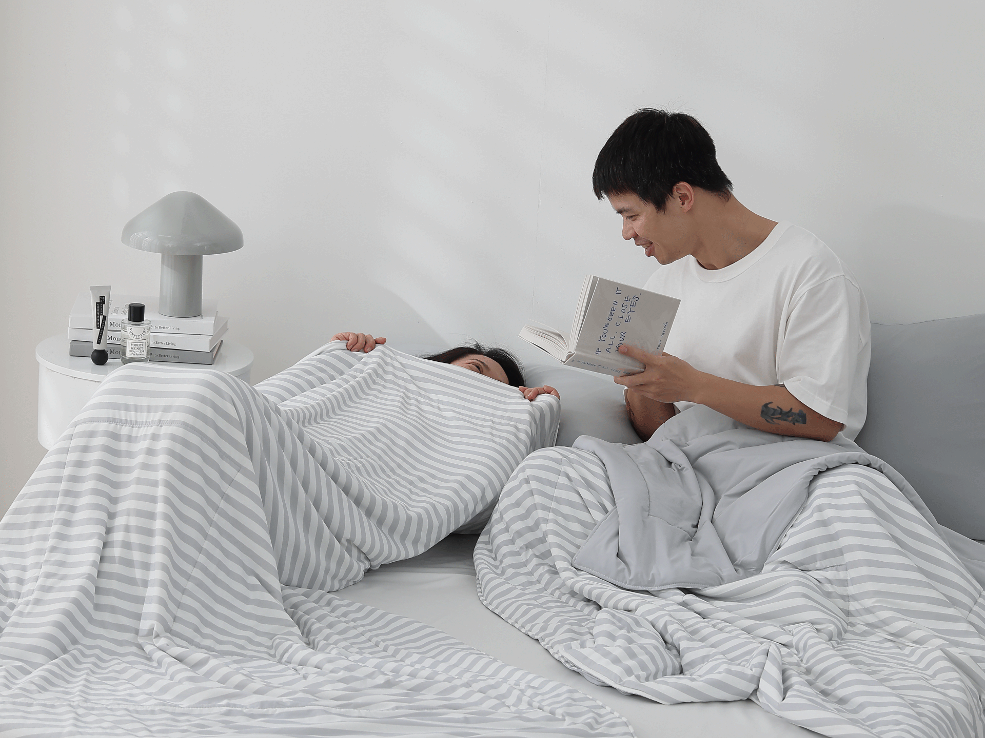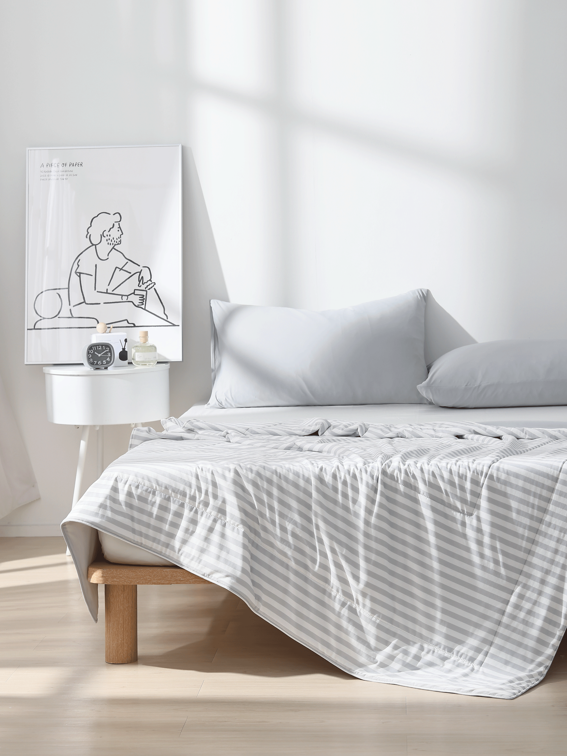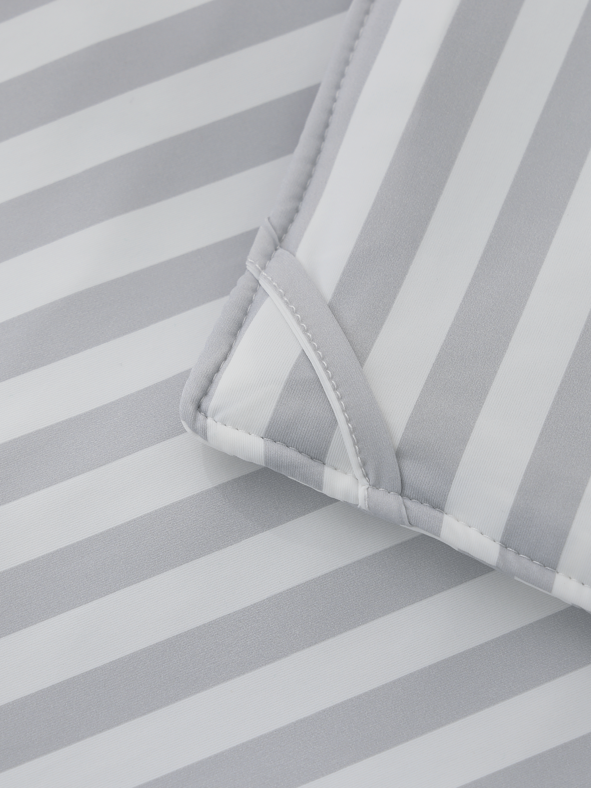 雙面涼感設計,打造雙倍涼感體驗,內裡加入奈米鋅離子,增加抗菌除臭功能。實用之外同時兼顧設計,花色為一面條紋、一面清涼薄灰,兩面交互使用,輕鬆打造房間風格。