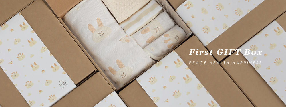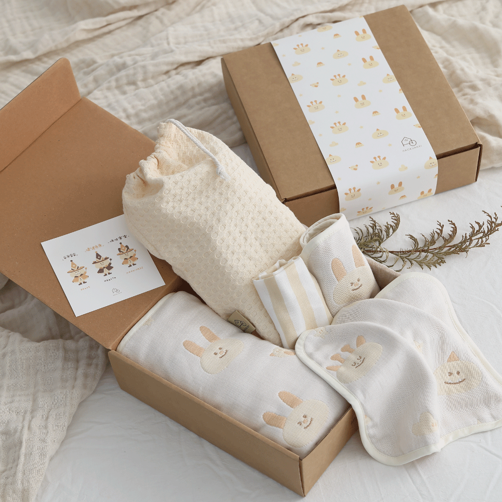 華夫格束口袋 1 入、彌月賀卡 1 入,使用禮盒包裝。