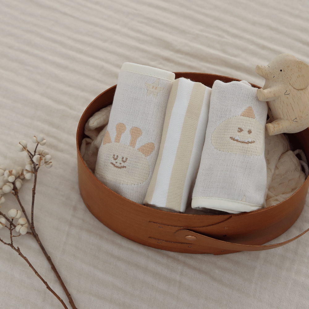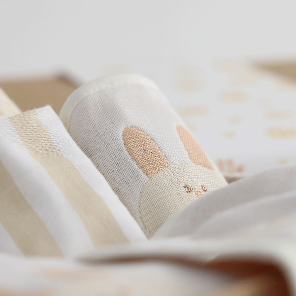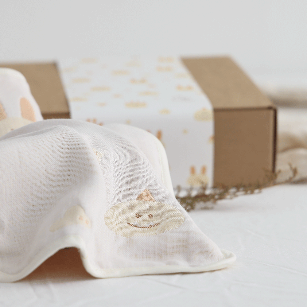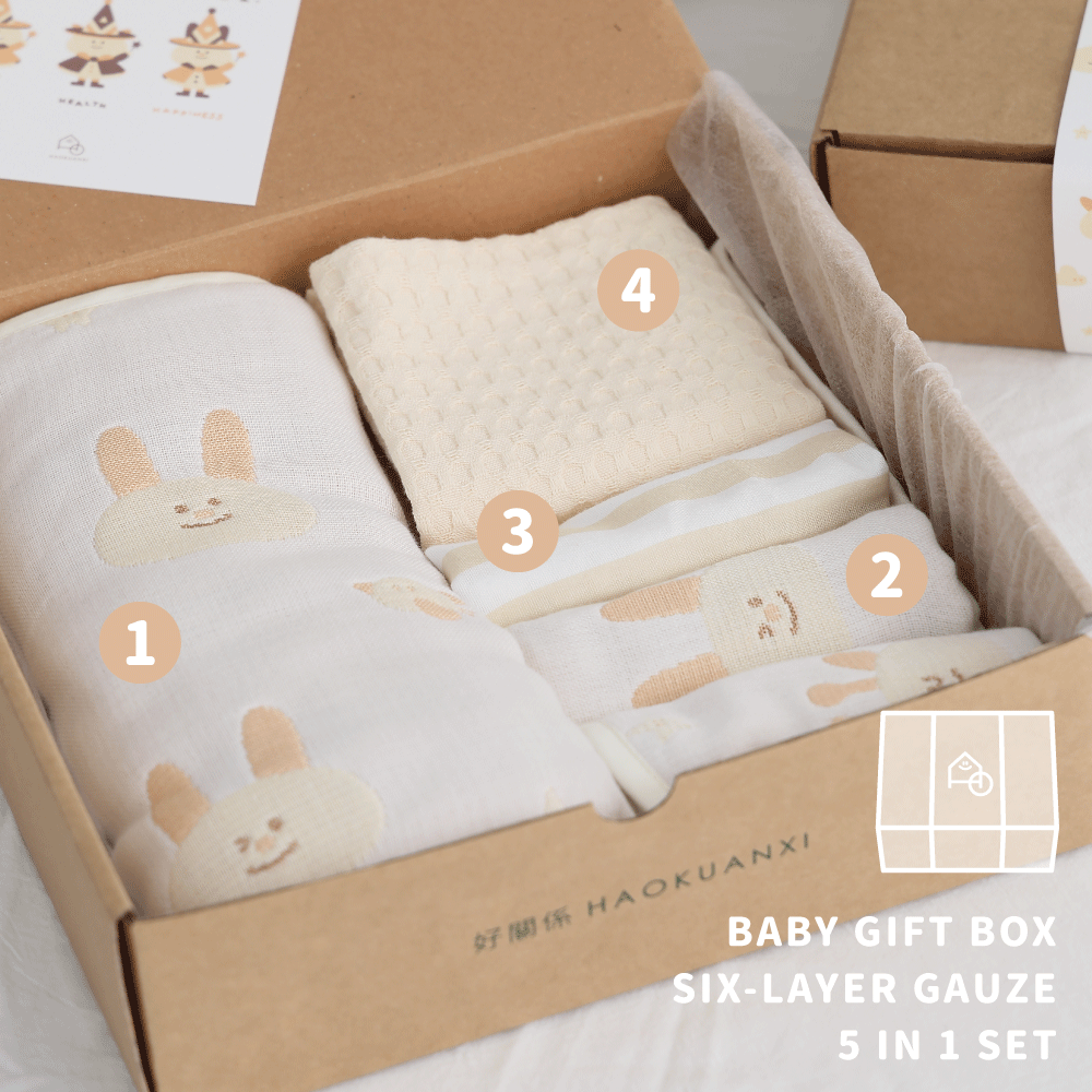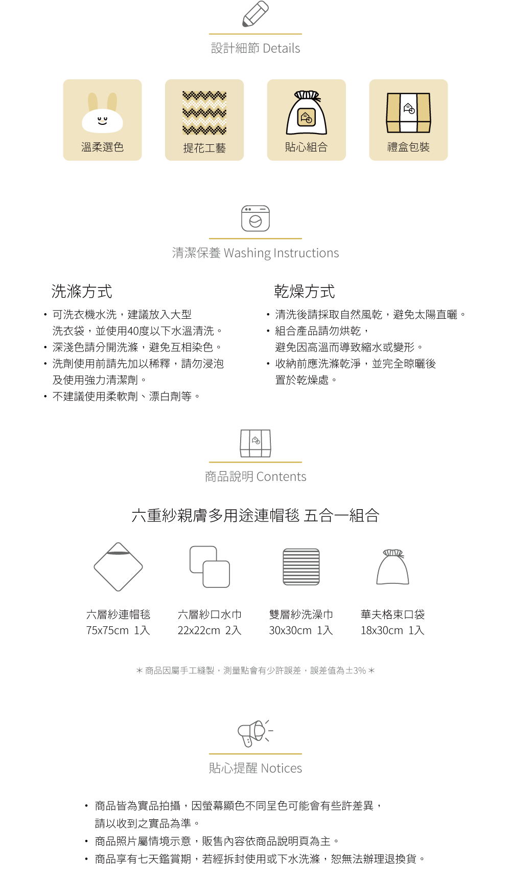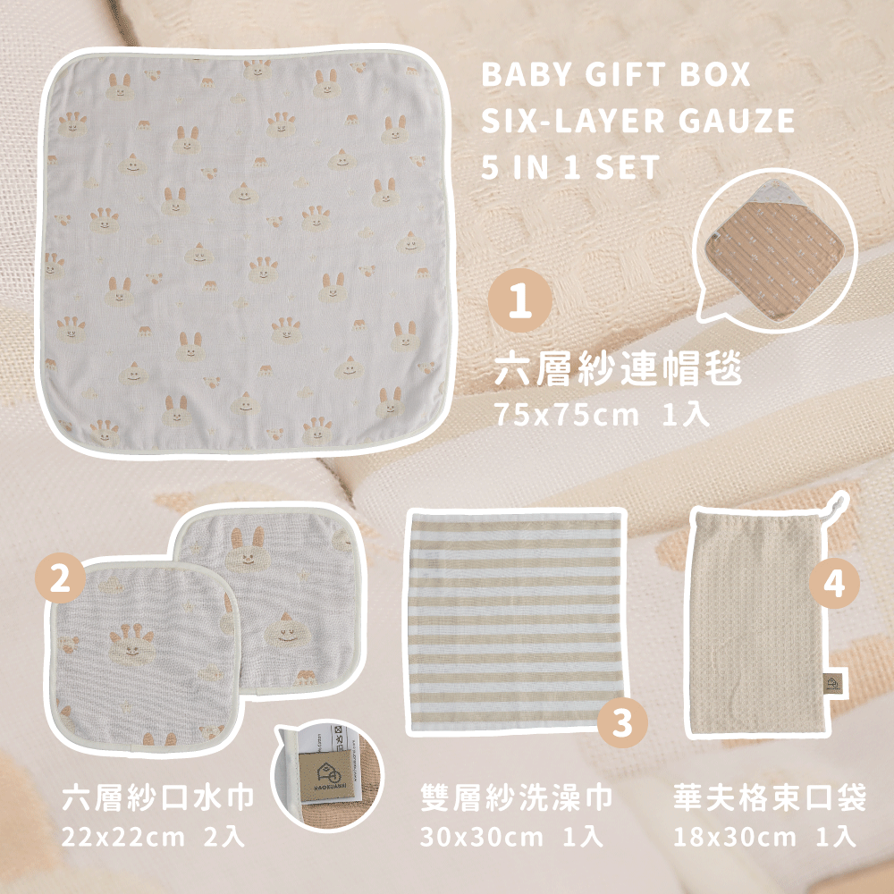 六層紗連帽毯 1 入、六層紗方巾/口水巾 2 入、雙層紗洗臉/洗澡巾 1 入、