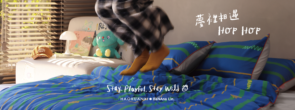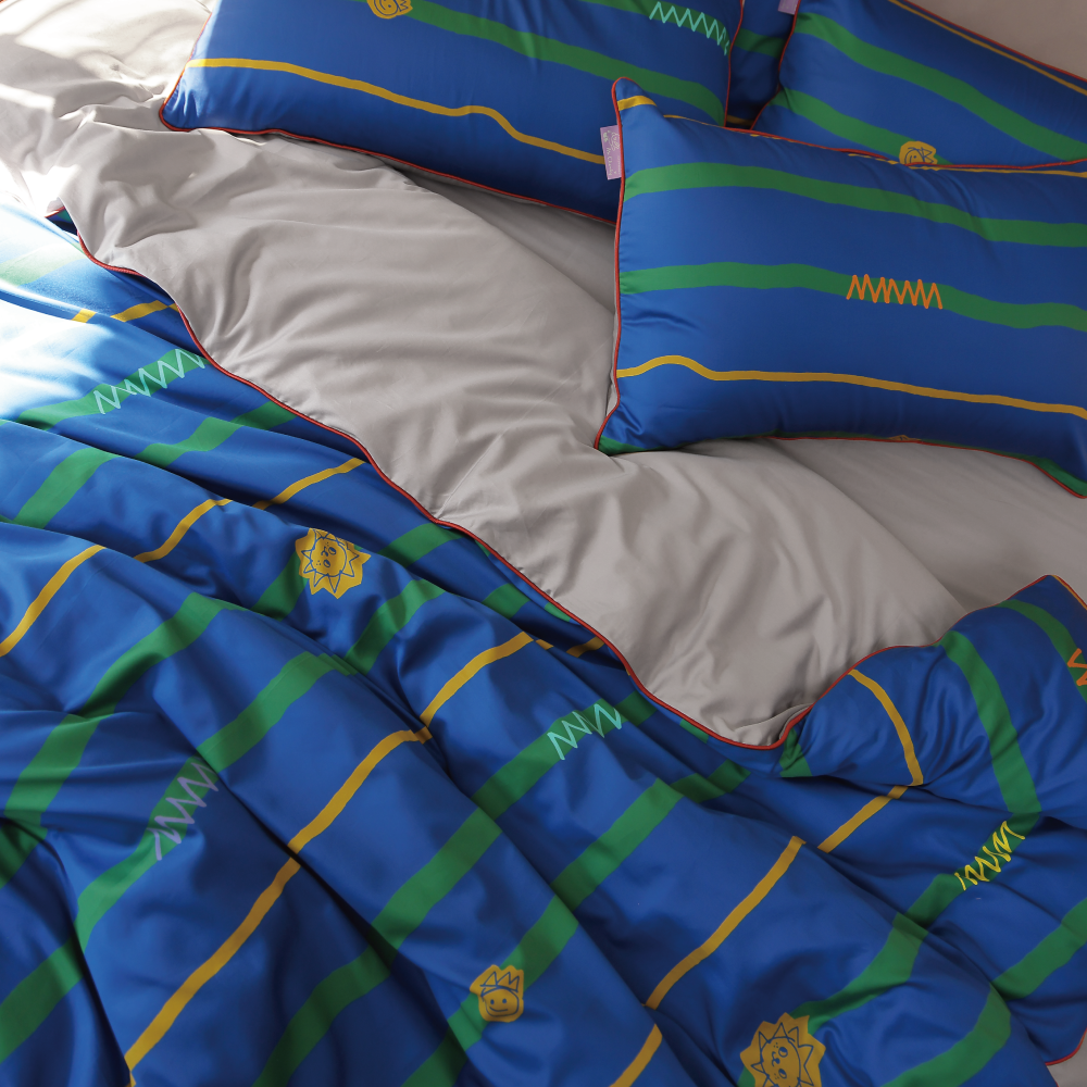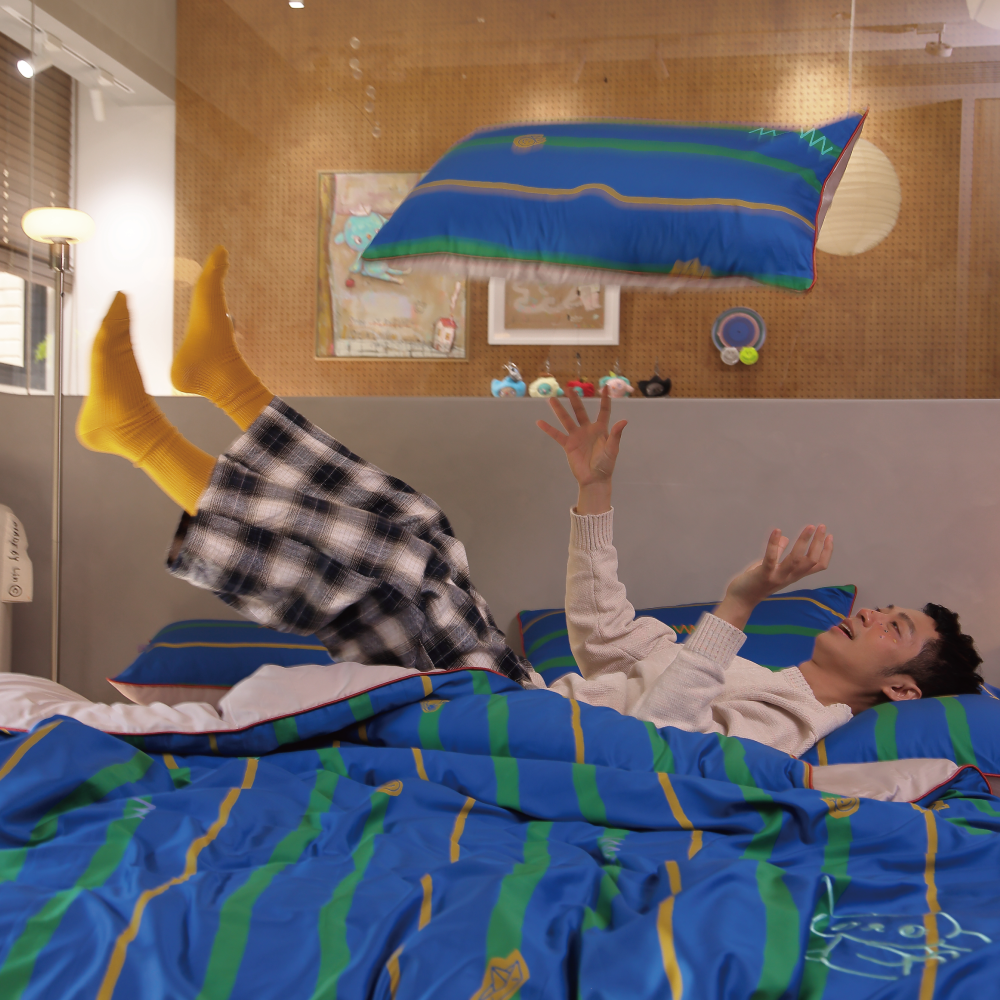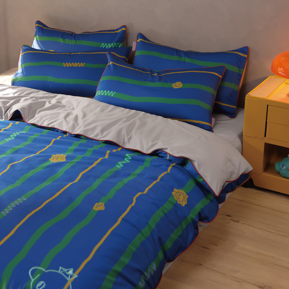 組合內含:灰色床包 1 入、獨家花色x灰薄被套 1 入、獨家花色x灰枕套 2 入、聯名卡片 1 入,使用聯名禮盒包裝。