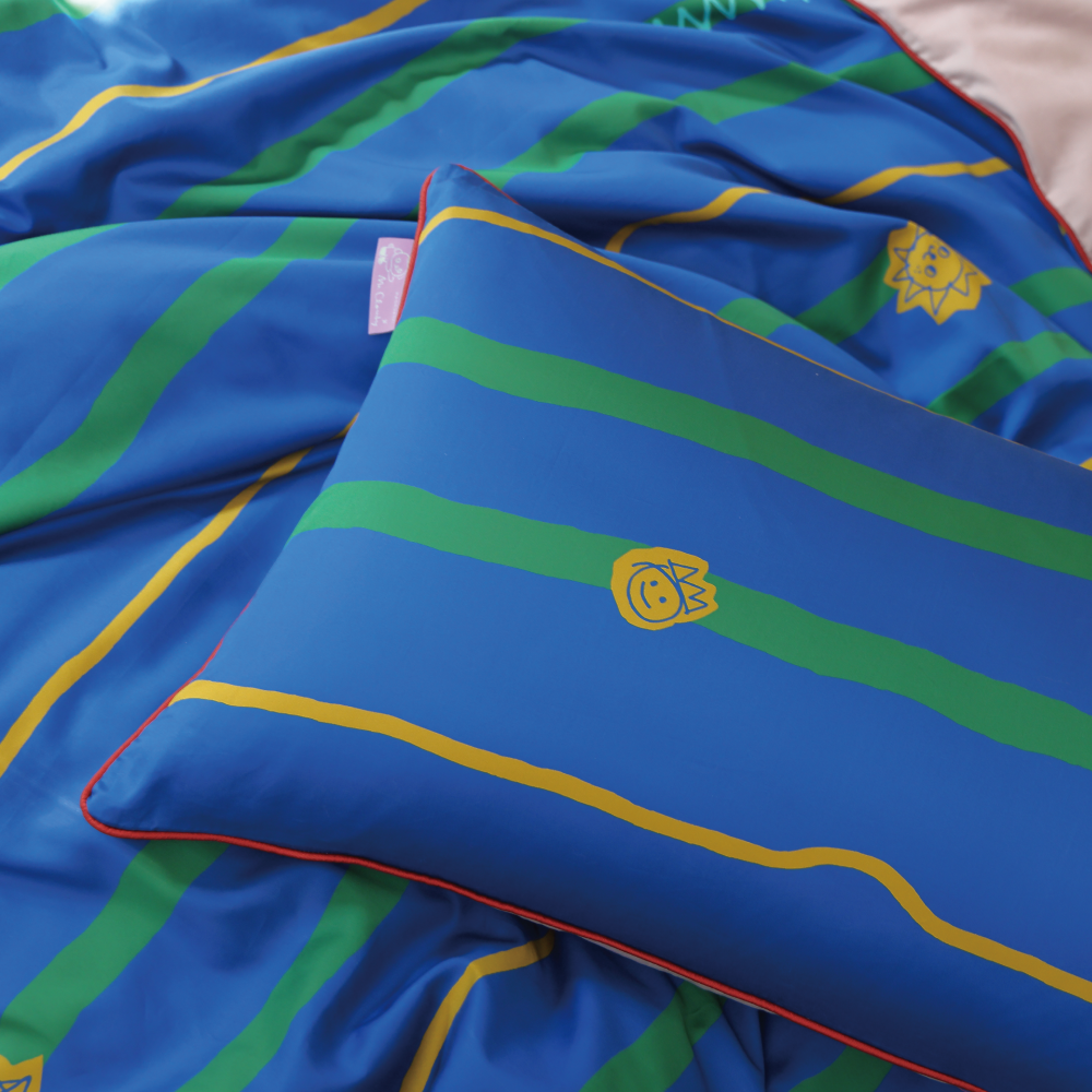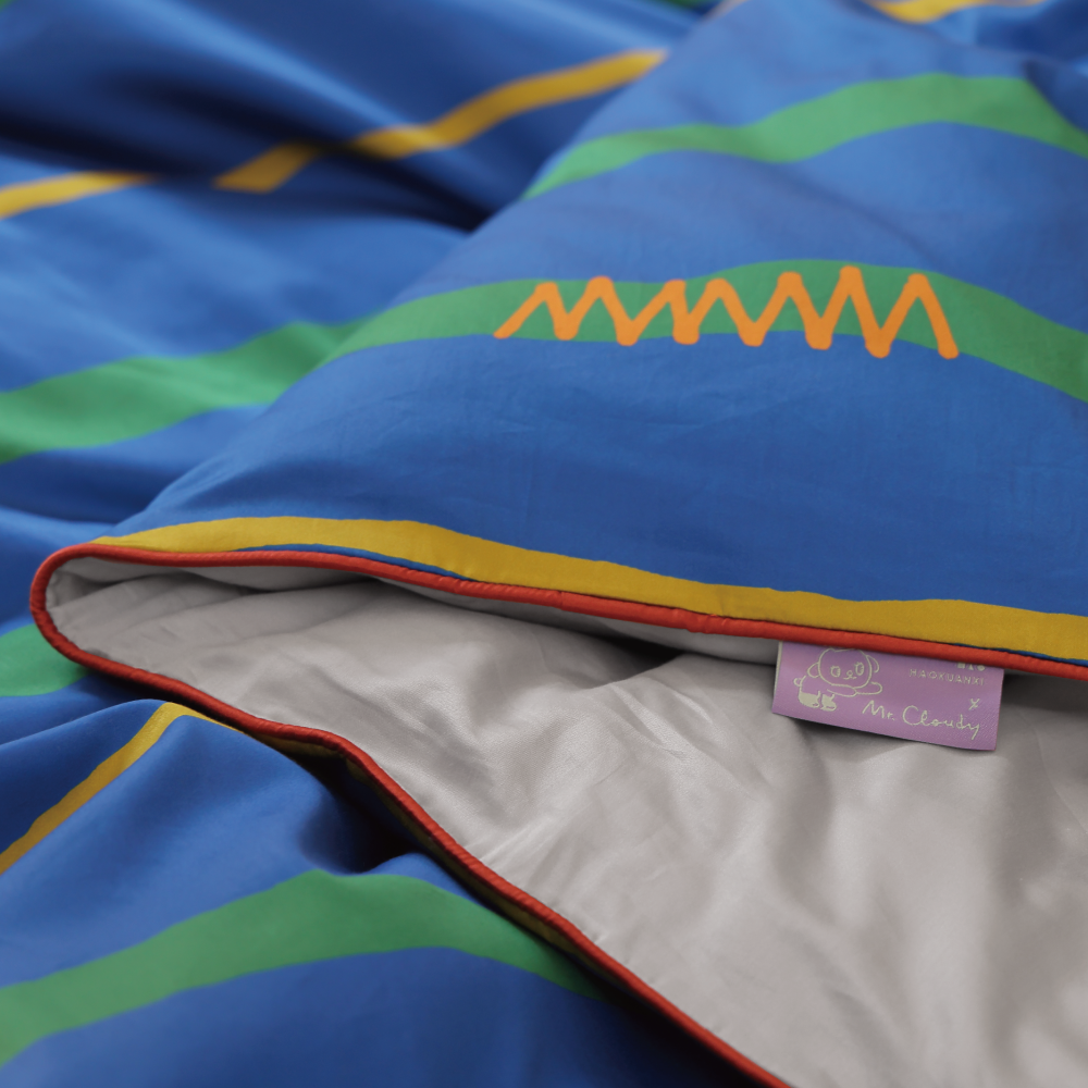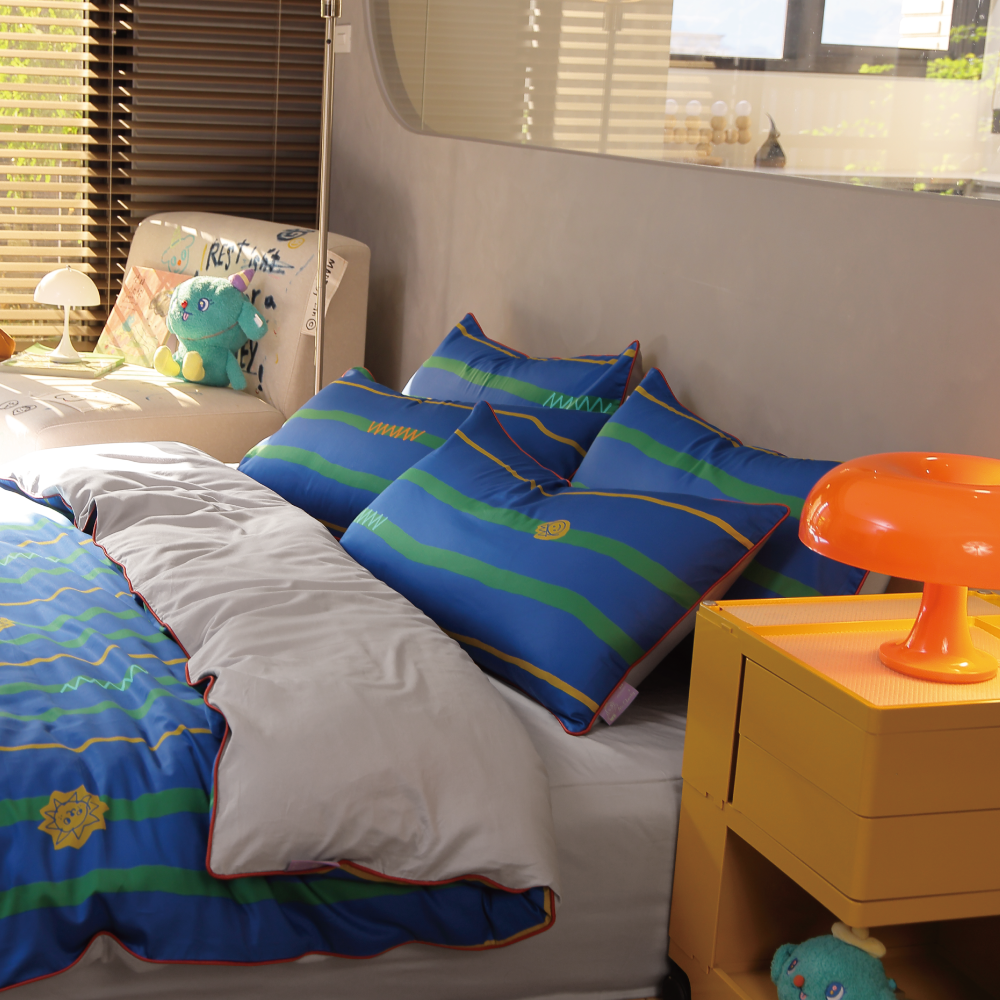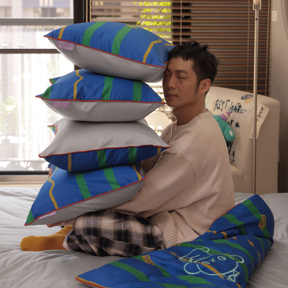 組合內含:灰色床包 1 入、獨家花色x灰薄被套 1 入、獨家花色x灰枕套 2 入、聯名卡片 1 入,使用聯名禮盒包裝。