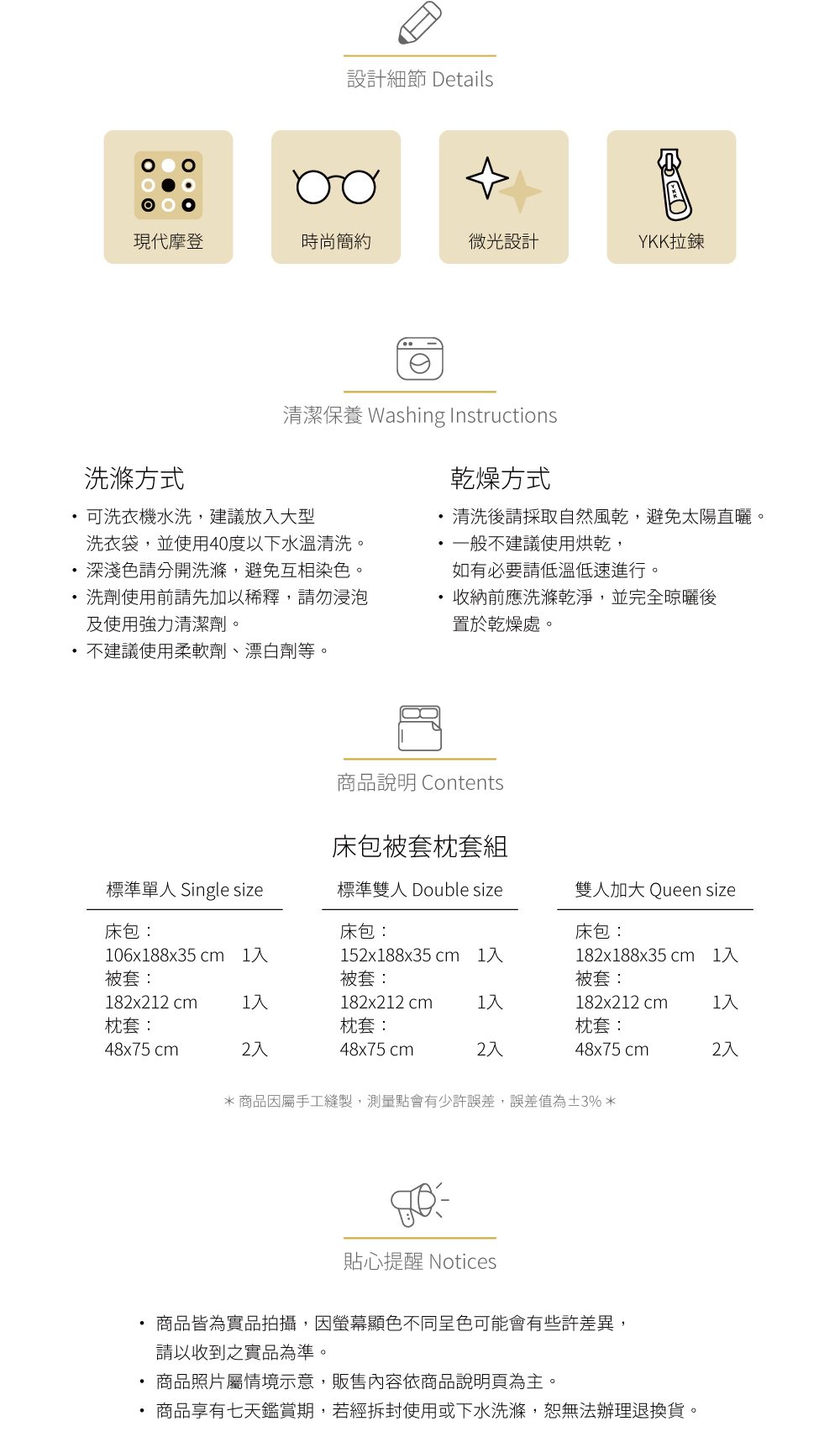 組合內含:床包 1 入、薄被套 1 入、枕套 2 入。