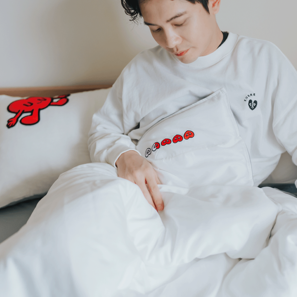 組合內含:淺灰床包 1 入、白x淺灰雙色薄被套 1 入、白x淺灰雙色枕套 2 入、聯名卡片 1 入,使用聯名禮盒包裝。