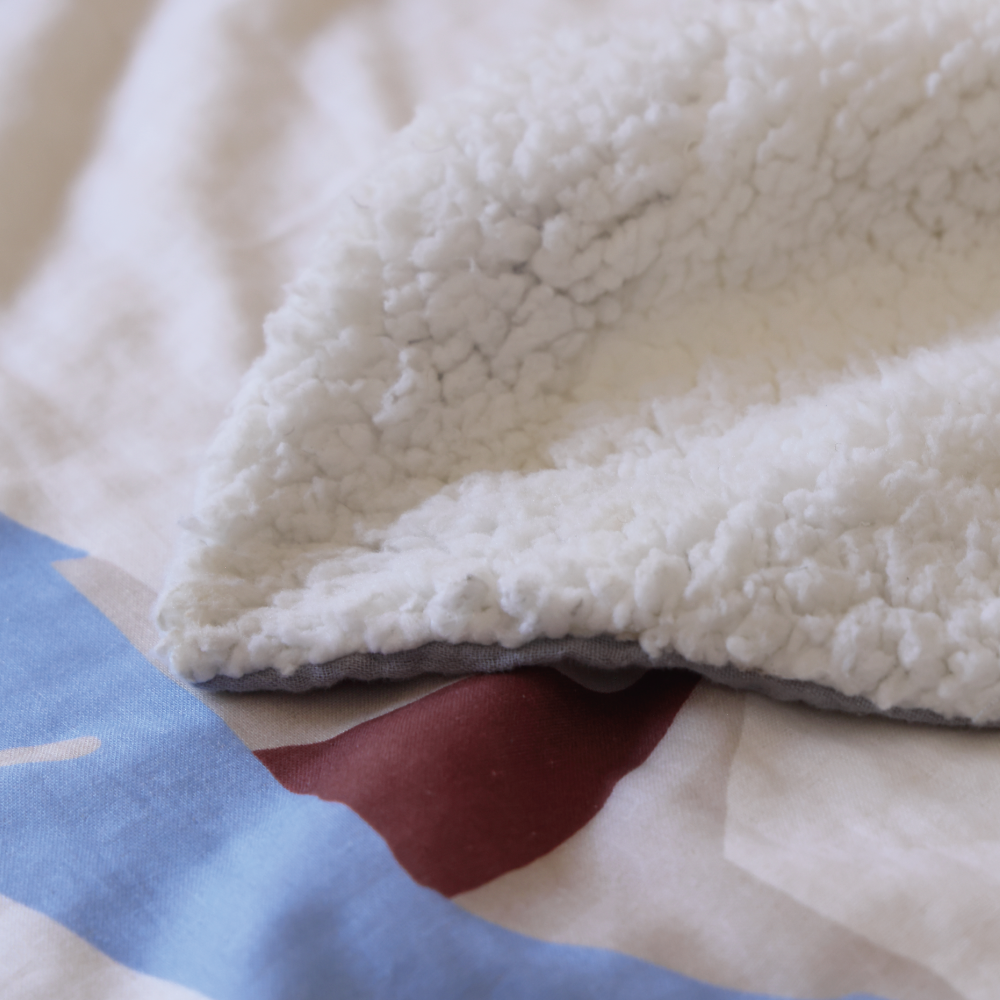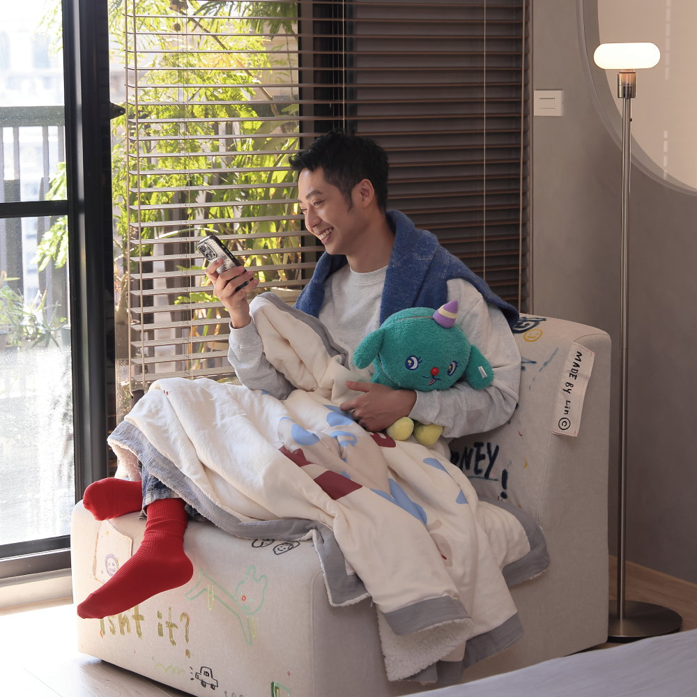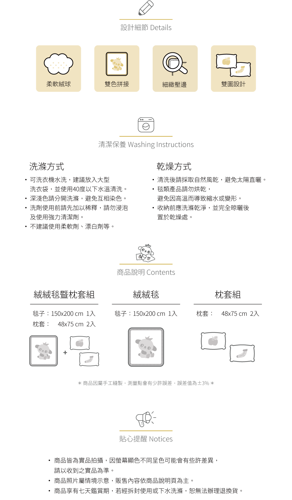 組合內含:絨絨毯 1 入、枕套 2 入、聯名卡片 1 入,使用聯名造型提袋包裝。