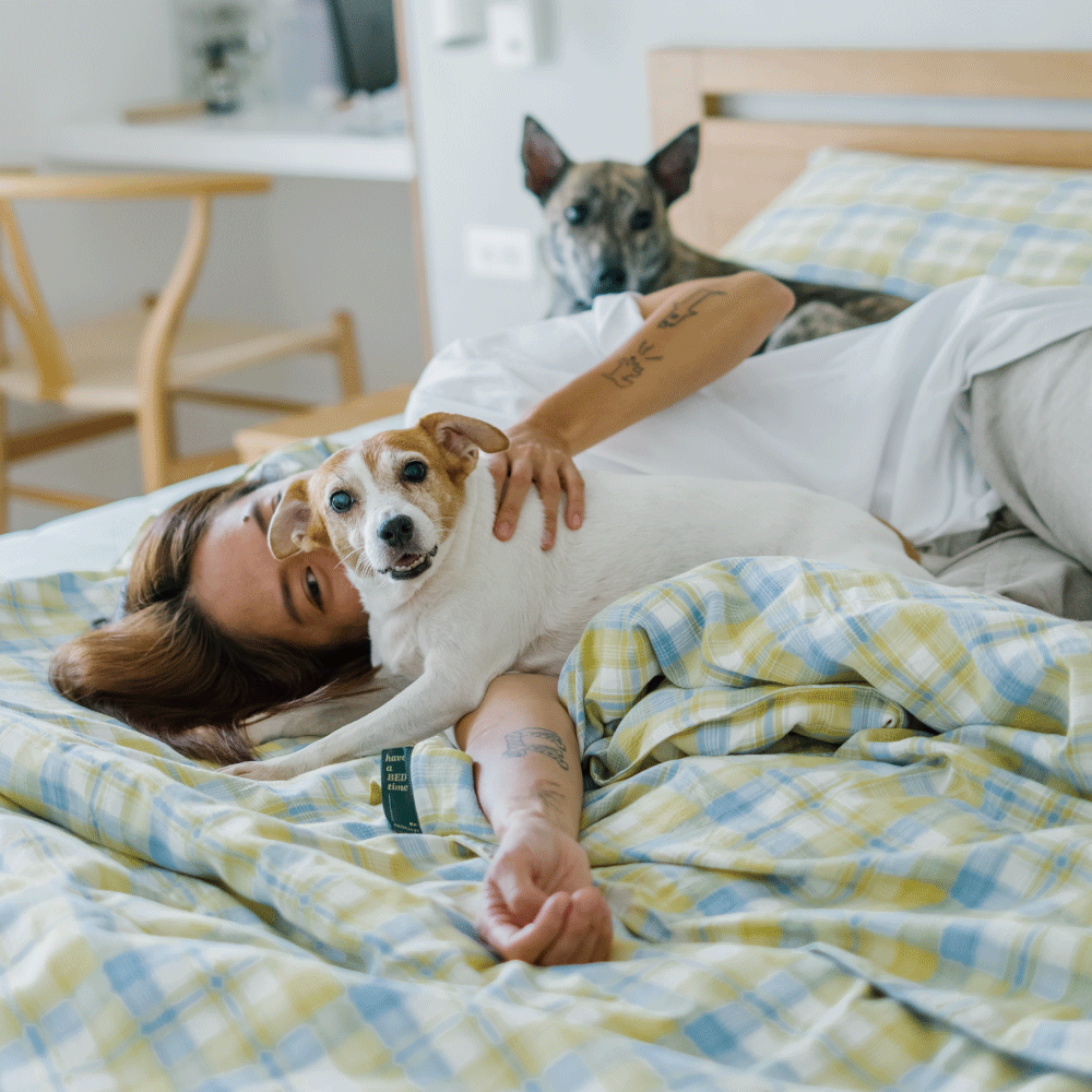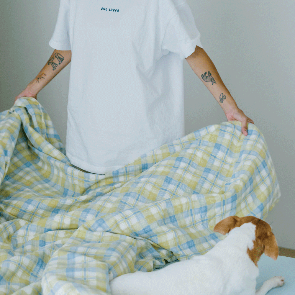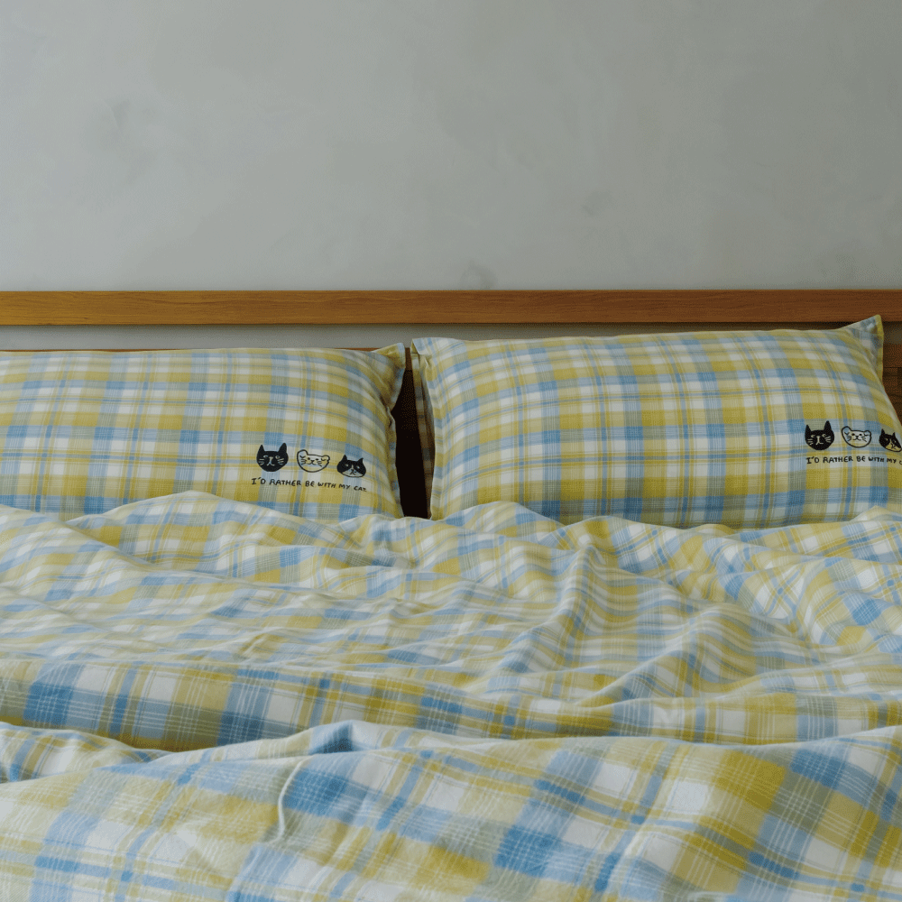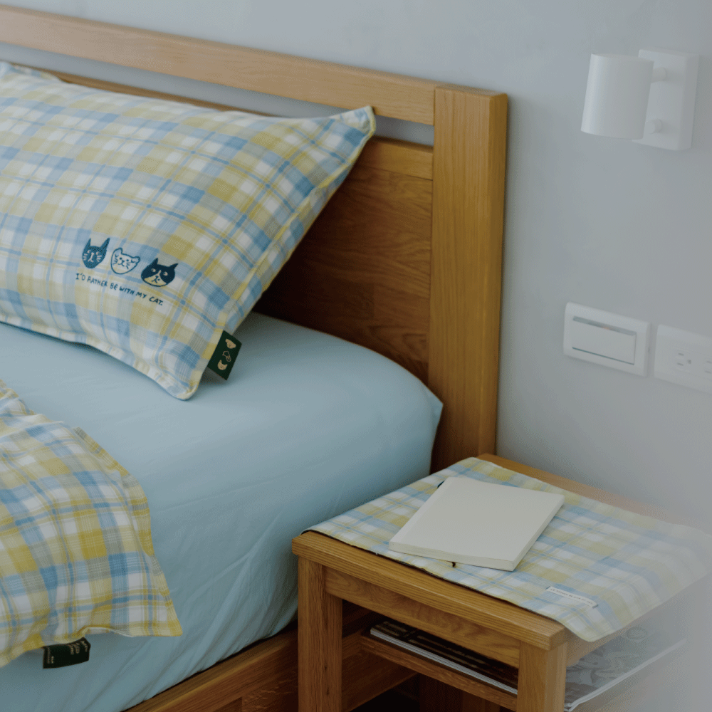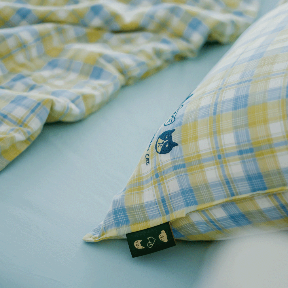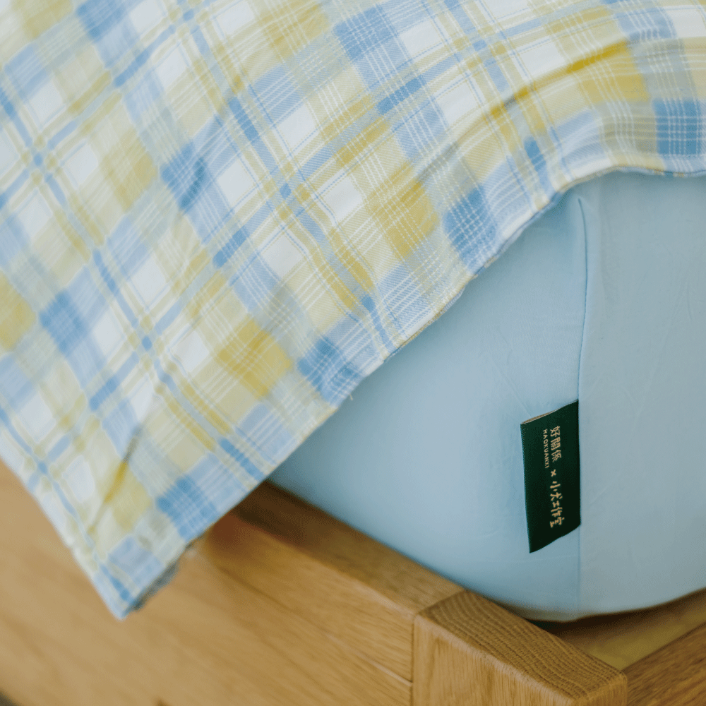 組合內含:床包 1 入、枕套 2 入、聯名卡片 1 入,晴空藍聯名束口袋禮物包裝。