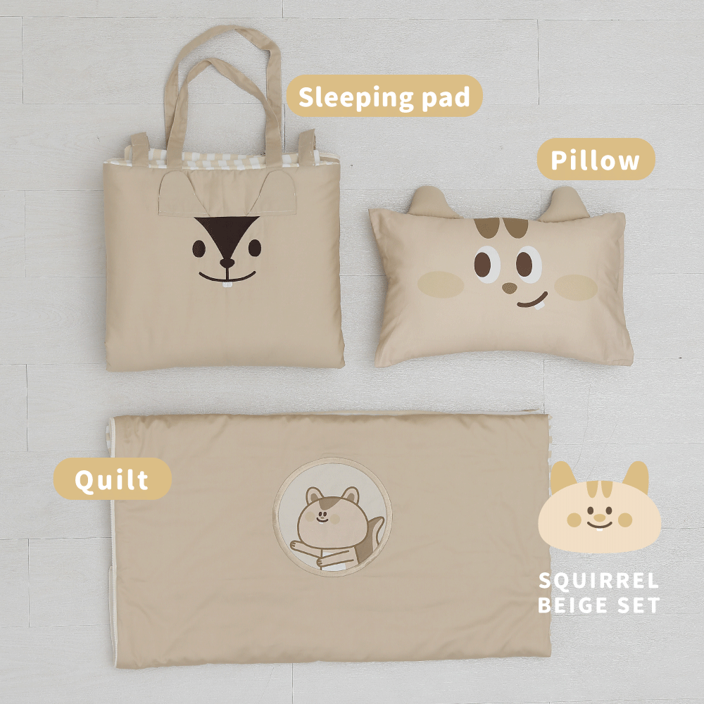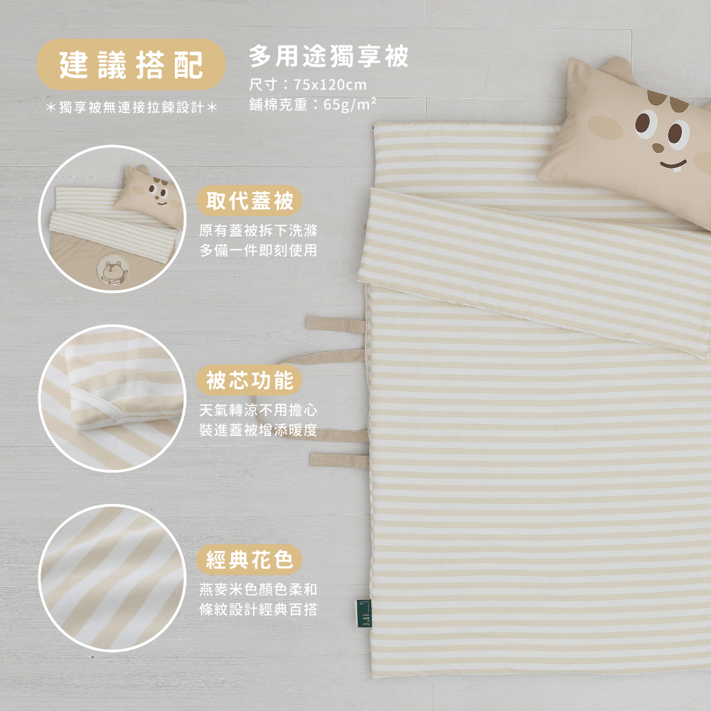 舒適睡墊、柔軟蓋被、動物造型枕,所有單品皆可分開或組合使用。